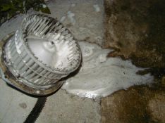 さて、すこし、作業時間を延ばして このブロアファンを掃除してみましょう!。 写真は取り外した時のファンです。 かなり、黒ずんでいまして、 虫等が挟まっている場合があります。 |