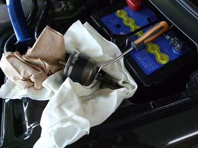 フィルターが外れたら、ガソリンは危険ですので フィルターに入っているガソリンを抜きます。 ペットボトルなどを使うと便利です。 |