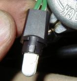 このようなライトが入っています。 ライトは汎用的なもので、よくスピードメーターの照明に 使われているものです。 第2期のライトには照明を緑にするために ゴムカバーがついています。 キーライトが無い年式のモデルは、 純正でこの部分のみ購入できます。 また、シガライターの電球部分もこれと同じです。 多分数百円ですので購入してみてください。 |